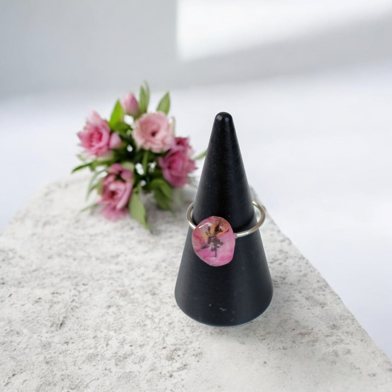 書道家がひとつひとつ丁寧に書いた文字に、アルコールインクアートの幻想的な色彩を重ねた、世界にひとつだけのリングです。