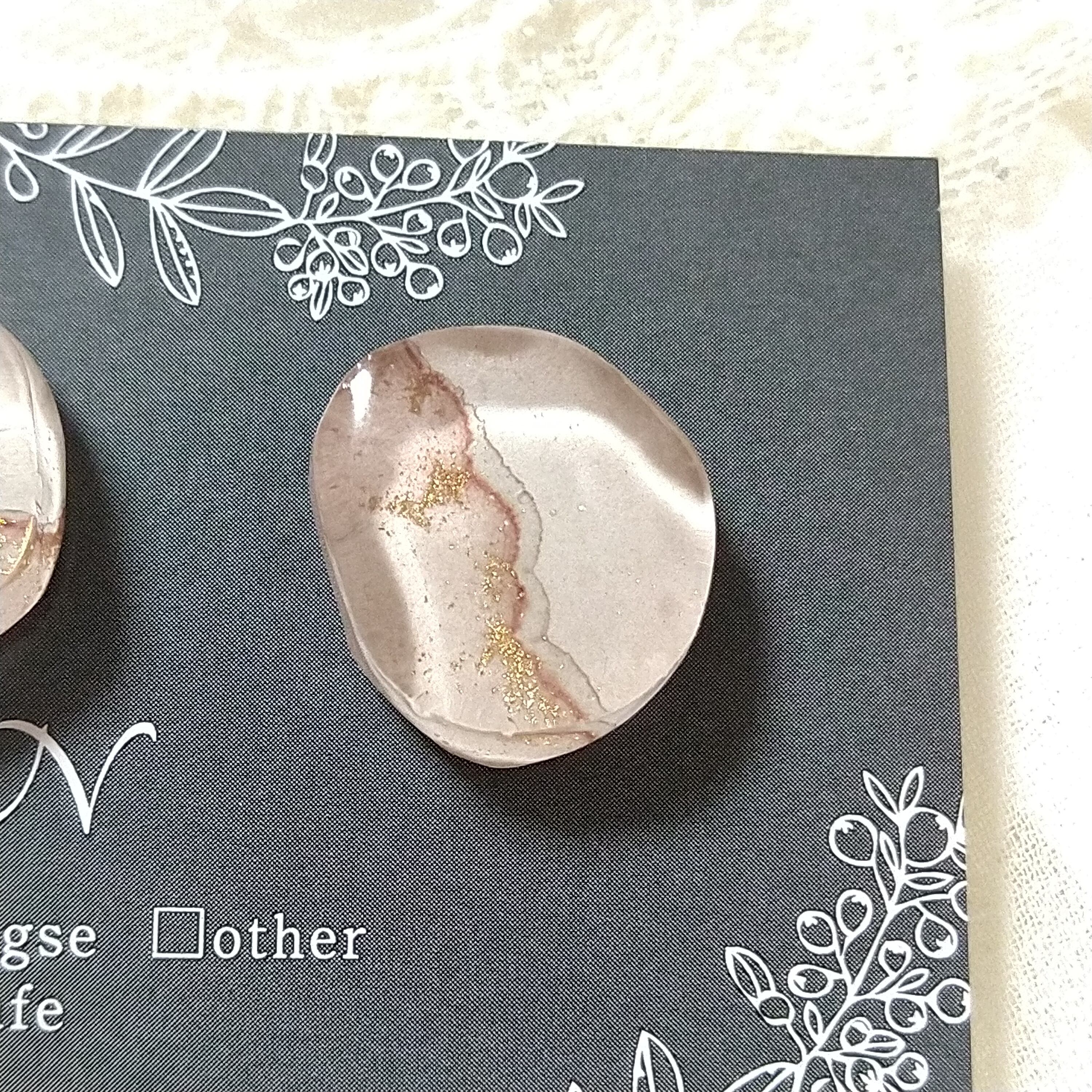 薄いベージュのアルコールインクアートを、レジンに封入しました。