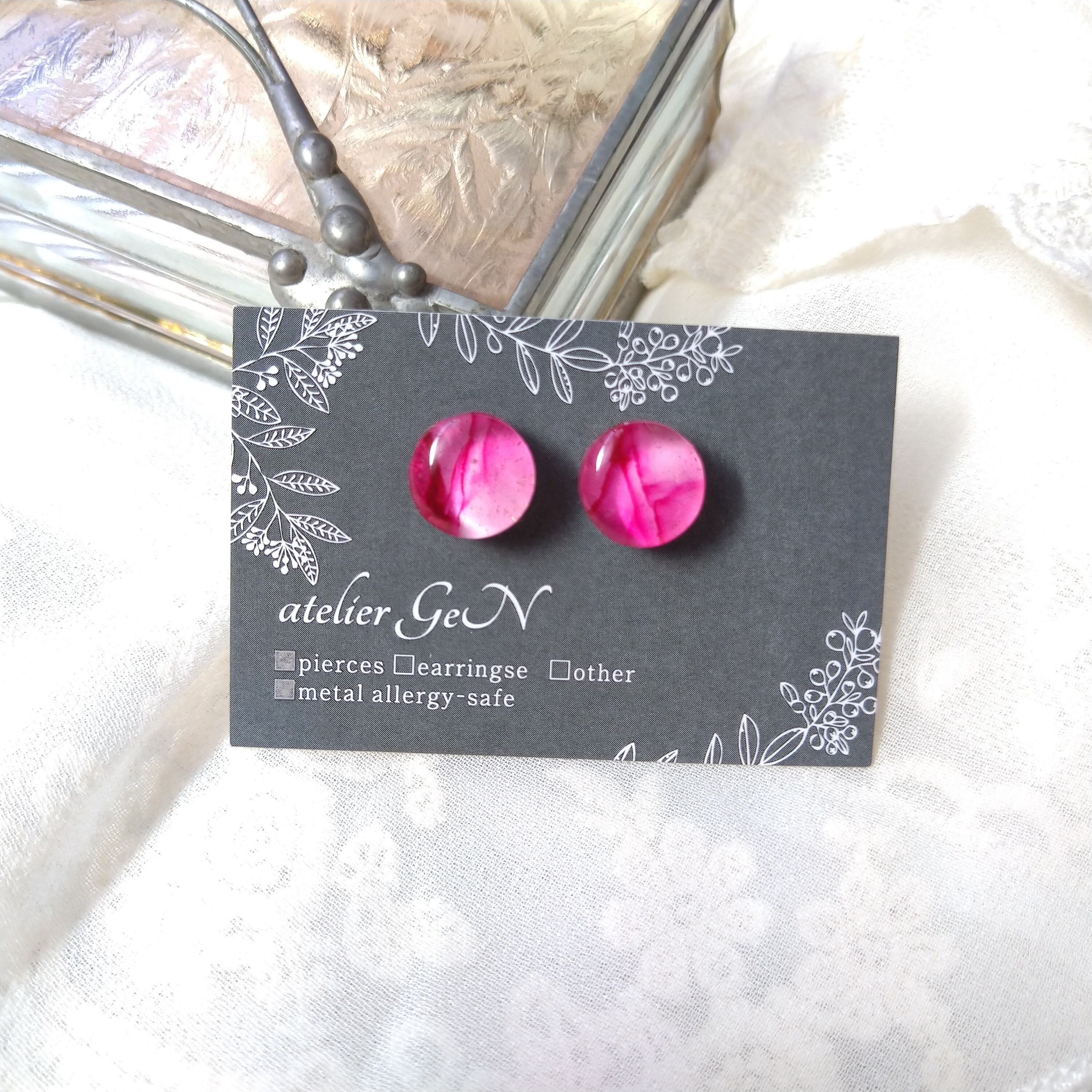 ピンクのアルコールインクアートをレジンに封入した小粒のピアスです。